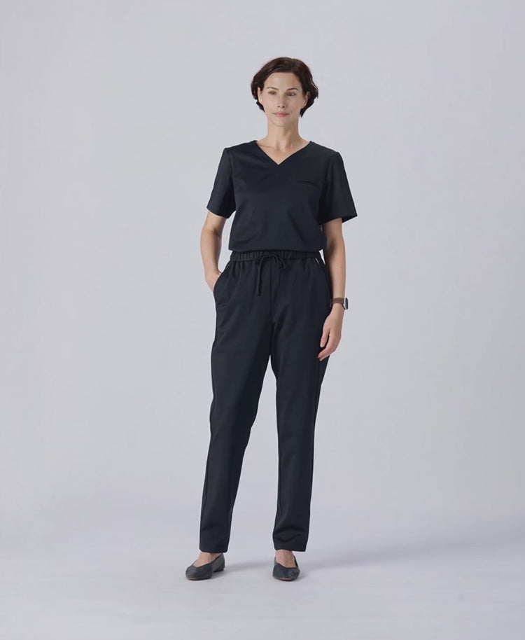 Sleek, slim silhouette scrub pants crafted from lightweight, stretchable, wool-like fabric, offering breathability, comfort, and effortless maintenance for all-day wear.